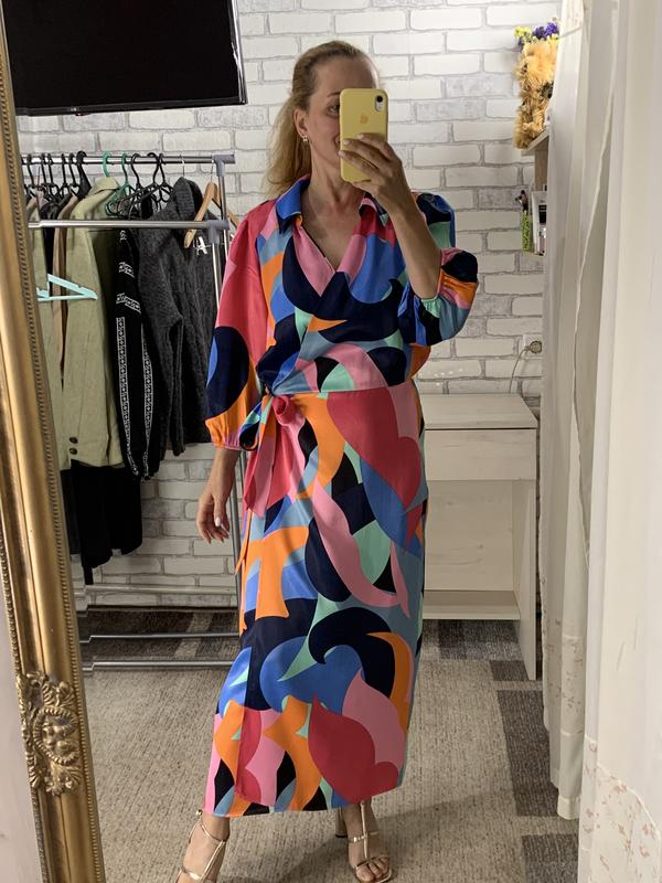 Нова шикарна яскрава сукня, бірки з магазину є! Крой на запАх, як по верху, так і внизу! 100% віскоза Розмір вказаний XL-XXL Плечі 38, по грудях 54, талія 39( тягнеться до 49), стегна 55, рукав 45, довжина 126 см