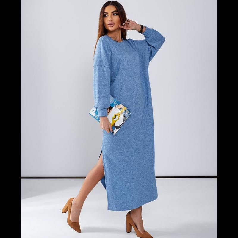 Теплое длинное платье миди прямого кроя свободное оверсайз с разрезом со спущенным плечем...