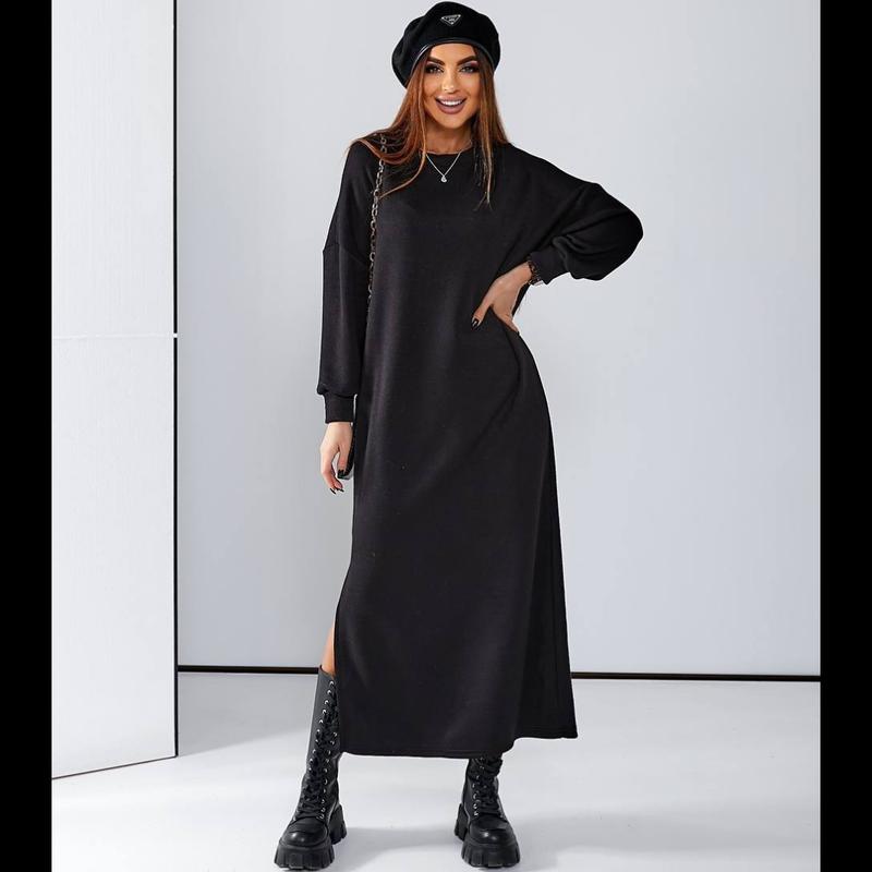 Теплое длинное платье миди прямого кроя свободное оверсайз с разрезом со спущенным плечем...
