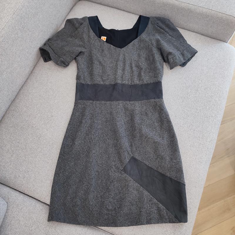 красиве плаття сірого кольору з м'якої вовни з елементами з натуральної шкіри, короткий рукав лихтарик, застібка- змійка по спині, стан ідеальний, розмір 42 італійський підійде на s-m