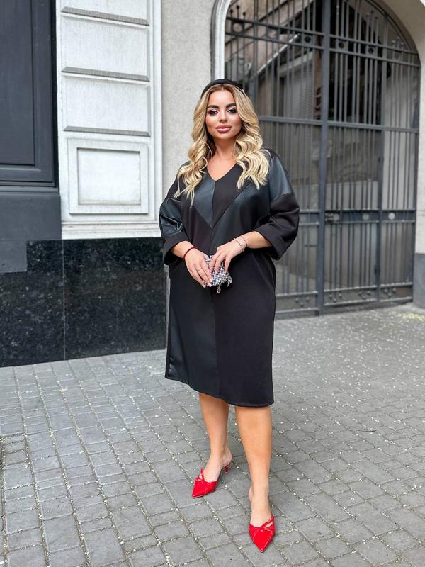 Плаття Модель 907VL Розміри: 46-48,50-52,54-56 Тканина : дайвінг , екошкіра Колір : чорний Вільне плаття , спущений рукав нижче ліктя , комбіноване плаття , з боків кишені, ззаду розріз. Параметри моделі-норми ОГ95, ОТ60, ОС95, зріст 170см, на ній одягнений 46-48; параметри моделі-батал ОГ110, ОТ86, ОС110, зріст 165см, на ній одягнений 50-52. Заміри виробу : Розмір 46-48: Обʼєм грудей 120 Обʼєм талії 112 Обʼєм стегон 114 Довжина рукава від горловини 59 Довжина плаття по спинці 109 Біцепс 48 Розмір 50-52: Обʼєм грудей 130 Обʼєм талії 120 Обʼєм стегон 126 Довжина рукава від горловини 60 Довжина плаття по спинці 111 Біцепс 50 Розмір 54-56: Обʼєм грудей 138 Обʼєм талії 128 Обʼєм стегон 136 Довжина рукава від горловини 64 Довжина плаття по спинці 111 Біцепс 51