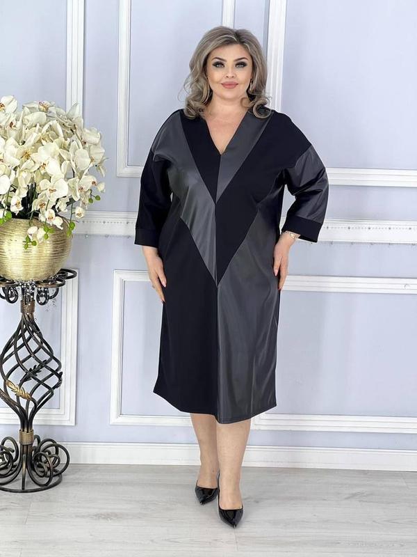 Юл 21 .10 🔥🔥🔥В НАЯВНОСТІ ХІТ ПРОДАЖУ 🔥🔥🔥 Платье Модель 9-0/0027/7 Размеры: 46-48,50-52,54-56 Ткань : дайвинг, экокожа Цвет: черный Свободное платье, спущенный рукав ниже локтя, комбинированное платье, по бокам карманы, сзади разрез. Параметры модели-нормы ОГ95, ОТ60, ОС95, рост 170см, на ней одет 46-48; параметры модели-балталл110, ОТ86, ОБ110, рост 165см, на ней одет 50-52. Замеры изделия: Размер 46-48: Объем груди 120 Объем талии 112 Объем бёдер 114 Длина рукава от горловины 59 Длина платья по спинке 109 Бицепс 48 Размер 50-52: Объем груди 130 Объем талии 120 Обʼєм стегон 126 Длина рукава от горловины 60 Длина платья по спинке 111 Бицепс 50 Размер 54-56: Объем груди 138 Объем талии 128 Объем бёдер 136 Длина рукава от горловины 64 Длина платья по спинке 111 Бицепс 51 Размер 58-60: Объем груди 150 Объем талии 140 Объем бёдер 146 Длина рукава от горловины 66 Длина платья по спинке 112 Бицепс 54 Размер 62-64: Объем груди 158 Объем талии 150 Обʼєм стегон 156 Длина рукава от горловины 67 Длина платья по спинке 112 Бицепс 58 Размер 66-68: Объем груди 174 Объем талии 160 Обʼєм стегон 166 Длина рукава от горловины 68 Длина платья по спинке 112 Бицепс 58 В2В
