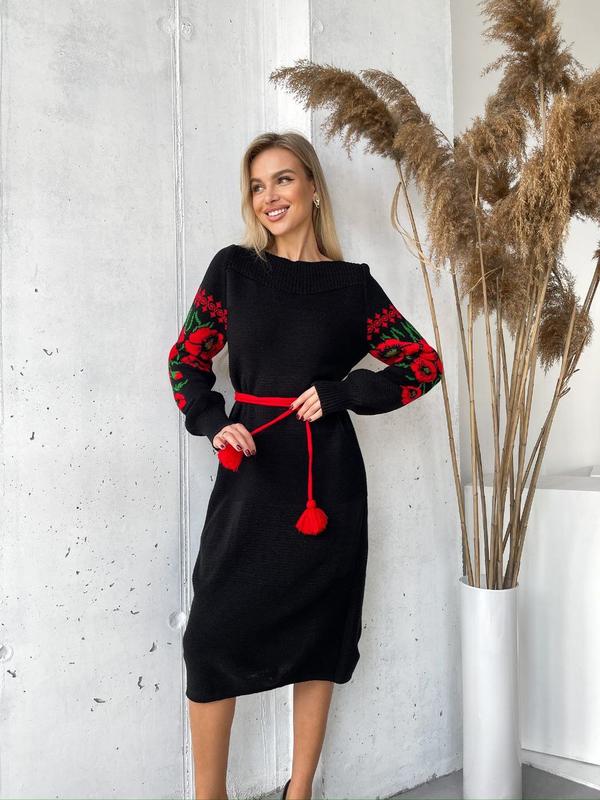 ‼️ОТПРАВЛЕНИЕ ВПРОДОВЖ 2-5 РАБОЧЫХ ДНЕВ!!️ Удобство и комфорт💫: Платье выполнено из мягкой и теплой ткани, идеальной для прохладной погоды. Яркий акцент✨: Пояс с кисточками подчеркивает талию и создает женственный силуэт. Теплое вязаное платье в этно стиле «Любаба». Материал: Вязаный трикотаж Страна производитель Украина💙💛 Размер: oversize 46-52 Состав пряжи: 50% шерсть, 50% акрил. Цвета: черный с желтым, черный с красным, черный с малиной, бордо, джинс. Рост девушки на фото 168 см Длина по спинке 103 см Длина рукава 65 см 1107
