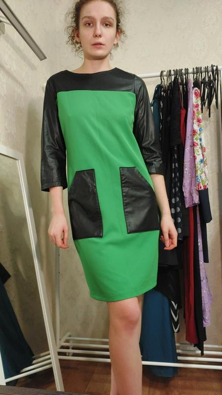 Зелена сукня міді з чорними вставками.