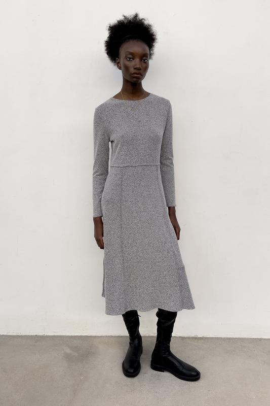 Трикотажное платье клеш. Трикотаж средней толщины, хорошо тянется. Нить - мелкое букле, миланж светло-серого с темно-серым цветом. Подойдет на рост +/-175. Замеры: полуобхват груди - 50 см полу охват талии - 41 см полуобхват бедер - 54 см длина - 122 см длина от плеча до линии талии - 39 см рукав - 61 см Состав: 56% коттон, 42% полиэстер, 2% эластан