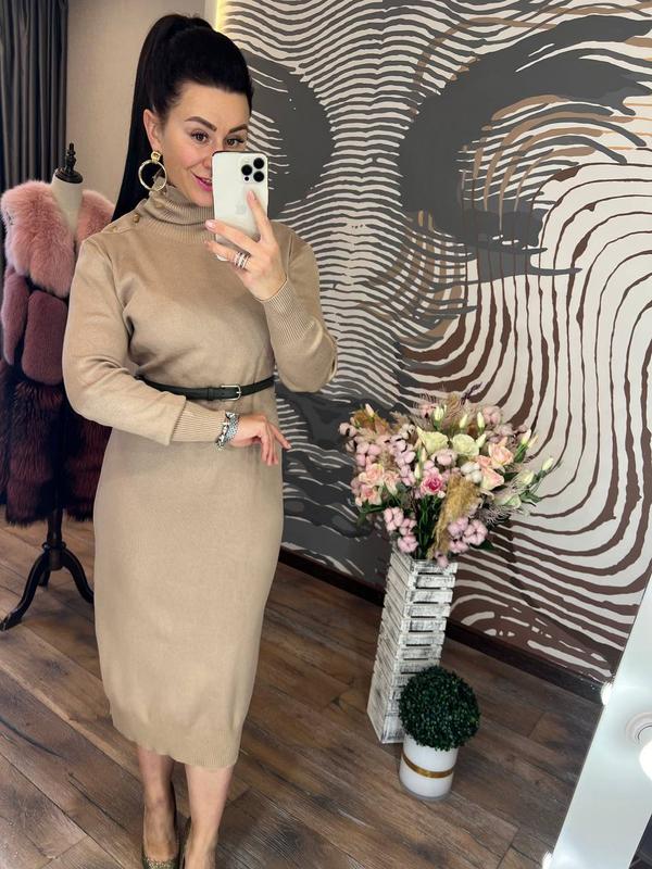 стильное и элегантное платье свободного кроя с высоким горлом на резинке внизу и рукавах, в комплекте с практичным поясом, будет отлично смотреться на вас в любой жизненной ситуации, она выполнена из приятного на ощупь трикотажа гладкой машинной вязки, декорированного яркими кнопками золотистого цвета на воротнике длина 120-122 см, пг 50-52 см, длина рукава от шеи 70-72 см размер 46-50 код 0463 1350 грн