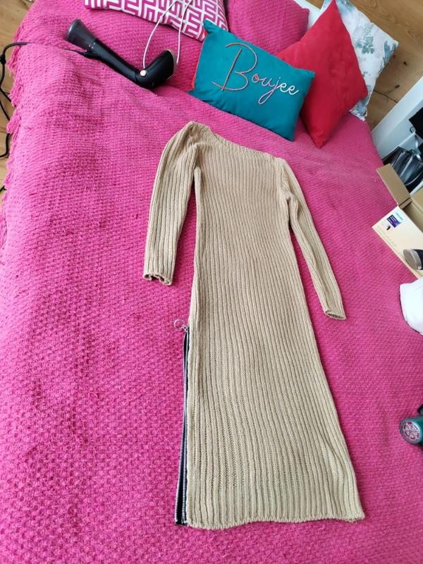 Трикотажное платье, в цвете кэмэл., с разрезом сбоку на молнии. Длина 114см. длина рукава 65