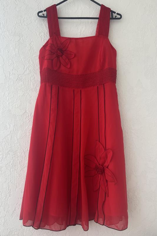 Код: 191 Женское новое платье, красного цвета, фирмы JV Selection Australia, размер 12, наш L (46) Ткань легкая 100% полиэстер. Снаружи легкий шифон прекрашен цветами, внутри атласная подкладка, которая не будет просвечивать. Сбоку на замочке. Длина без бретель 87 см, длина половинки брители 19,5 см,в груди 43 см, в талии 40,5