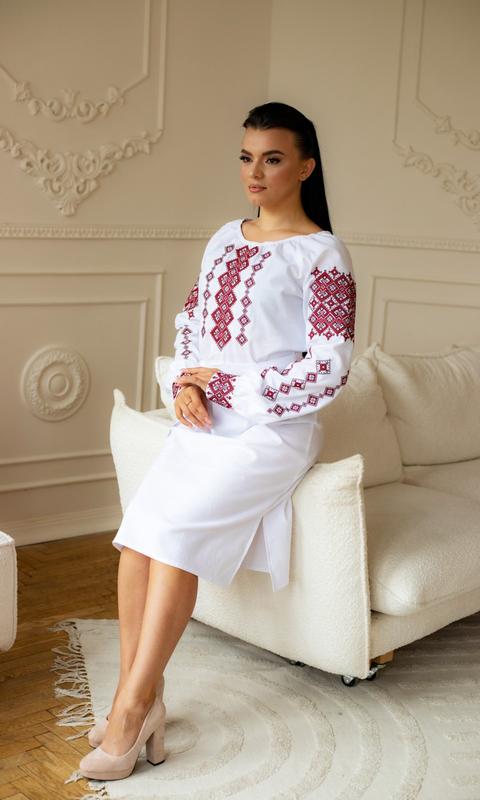 Женское платье с красно-коричневым геометрическим орнаментом. В комплекте к платью есть пояс, благодаря которому можно подчеркнуть талию. Практичная длина, рукава, щедро украшены яркой вышивкой, и неповторимые украинские мотивы - главные приманки этого платья. Тканина - 98% бавовна, 2% поліестер. От 50 р + 200 грн От 54 р +300 грн
