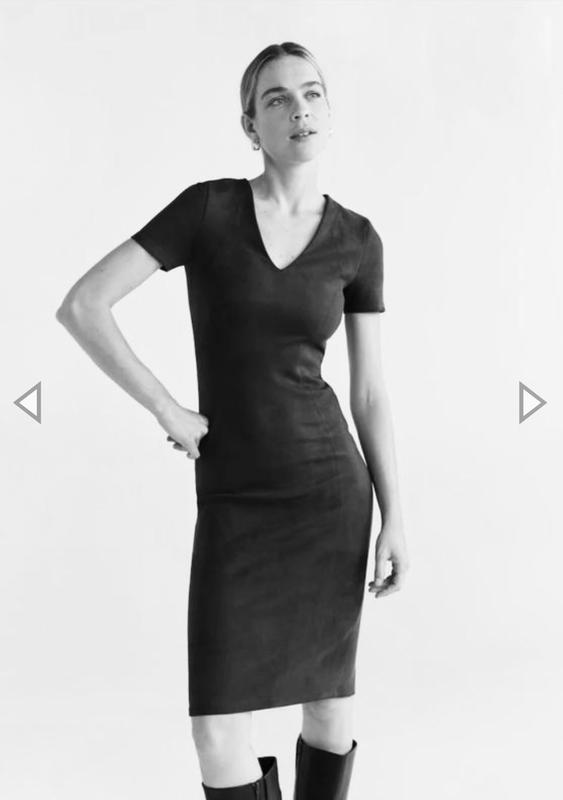 Платье манго, замш ткань плотная, черный насыщенный цвет, размер 36, длина миди, сзади разрез Длина 103 см, пог 38, пот 31 см, бедра 40 см полуобхват, тянется, отлично на 34-36 размер