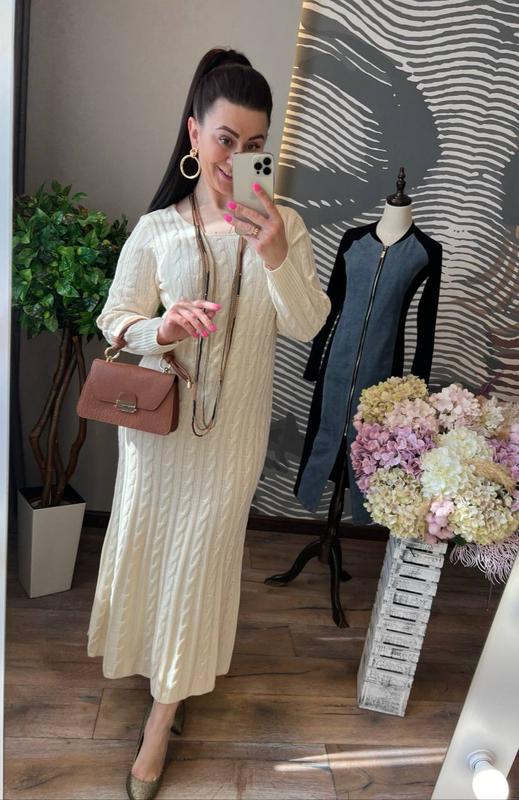 уникальное по красоте, качеству и стилю платье длины миди приталенного кроя с оригинальной юбкой, расклешенной к низу, круглым горлом и длинными рукавами платье выполнено из качественного и приятного к телу трикотажа машинной вязки из хлопковой нити с невероятно красивым узором в этом платье вы несомненно прикуете взгляды окружающих, и будете комфортно себя чувствовать в будни и праздники размер 46 длина 135-136 см, н г 48-50 см, длина рукава от шеи 67-68 см код 1203