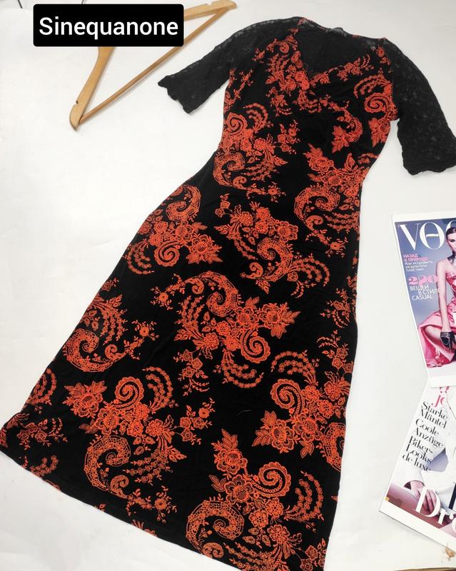 стильное женское платье-миди футляр черного цвета в оранжевом принте абстракции с укороченными кружевными рукавами, в идеальном состоянии 😉