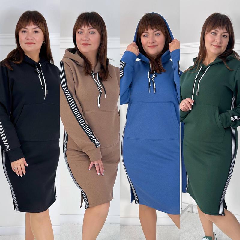Платье Ткань трехнитка на флисе (производство Турция, 90% хлопок) Цвет черный, мягко, джинсовый, изумрудный Размер 48-50,52-54,56-58 Очень теплое приятное к телу платье, с капюшоном и карманом. По бокам и на рукавах декорировано лампасами. Снизу по бокам небольшие разрезы. НЕ КАШЛАТИТЬСЯ!!! Цена: 920 грн