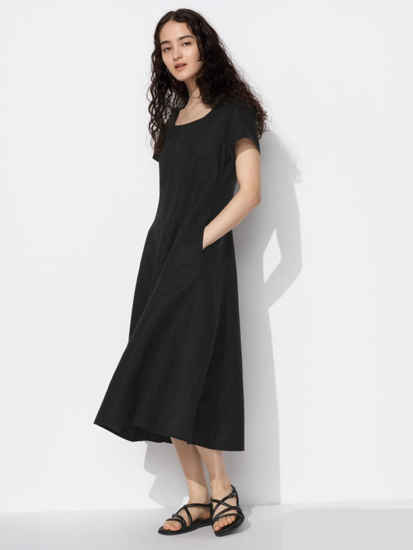 Склад: 67% ліоцел, 33% льон LINEN BLEND SQUARE NECK SHORT SLEEVE DRESS елегантна тканина з суміші льону облягаючий крій елегантний квадратний виріз бічні кишені застібка-ковзанка ззаду універсальний дизайн чудово поєднується з будь-яким взуттям