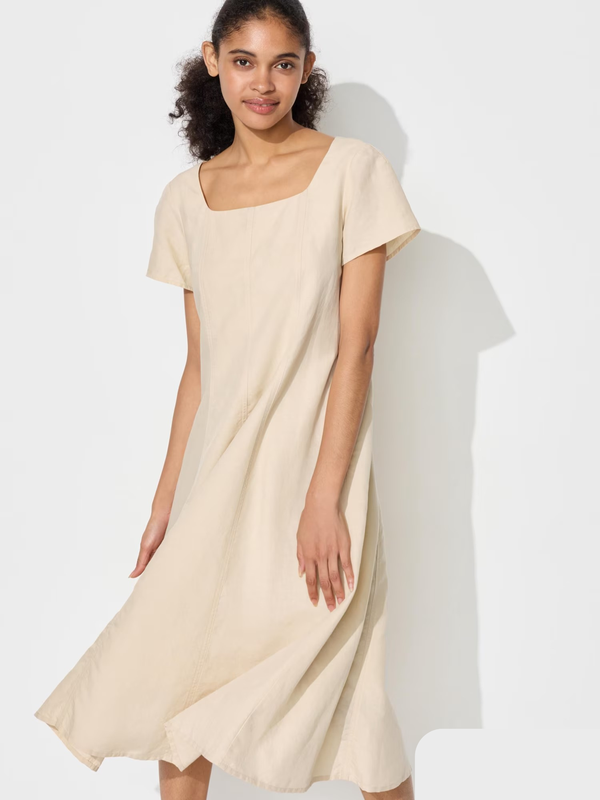 Склад: 67% ліоцел, 33% льон LINEN BLEND SQUARE NECK SHORT SLEEVE DRESS елегантна тканина з суміші льону облягаючий крій елегантний квадратний виріз бічні кишені застібка-ковзанка ззаду універсальний дизайн чудово поєднується з будь-яким взуттям