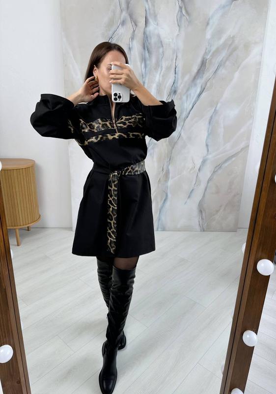Сукня модель 924/1924 Размер 42/46 48/52 Ткань тиар ( коттон+полиэстер), вставки леопард эко-кожа текстурированная Турция 🇹🇷 Очень красивое и удобное платье прямого кроя, можно носить с ремешком или без. Вставки из эко кожи очень стильные и эффективно дополняют образ. По бокам карманы, пояс из двух частей- экокожа+ ткань Рукава полной длины, поднимаются с помощью леопардового патика с застежкой пуговицы. Цвет черный со вставками ( рисунок леопарда может меняться) СУПЕР КАЧЕСТВО и доступная цена