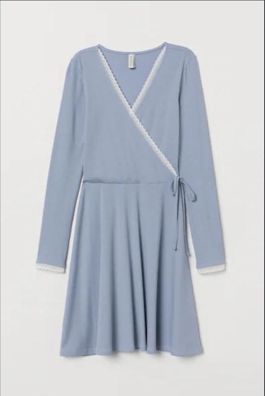 Описание и размер Короткое платье из мягкого трикотажа в рубчик с кружевной отделкой, V-образным вырезом и вшитой оберткой спереди с декоративными завязками с одной стороны. Длинный рукав, шов на талии и юбка клеш. Без подкладки. размер: m,l Длинный рукав Стиль: Обертка Декольте: V-образный вырез Голубино блакитний, однотонний новое очень приятное к телу лёгкое рр-м пог_45-55 пот-38-45 рукав-63 длинна-95см