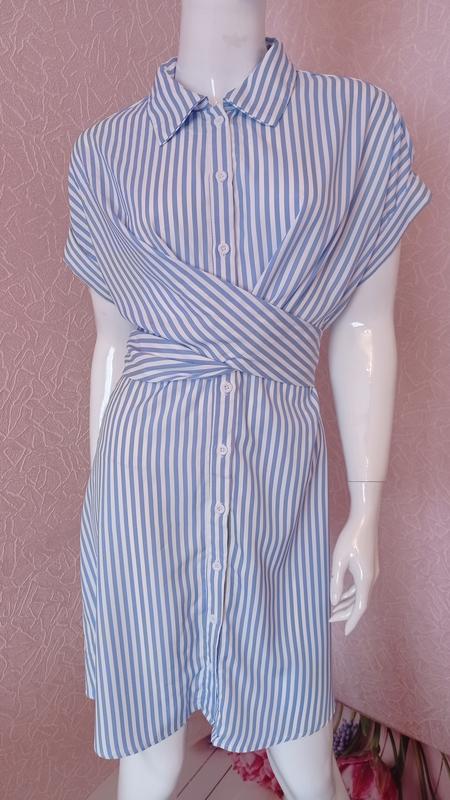 Класна сукня сорочка у смужку, можна пасок зав'язувати по-різному. По всій довжині ґудзики. Легка, не парить. Стан ідеальний, як нова. Розмір М, орієнтуйтеся на заміри: довжина 88 см, груди 45 см, талія 46 см (регулюється паском), рукава від горловини 25 см, стегна 52 см