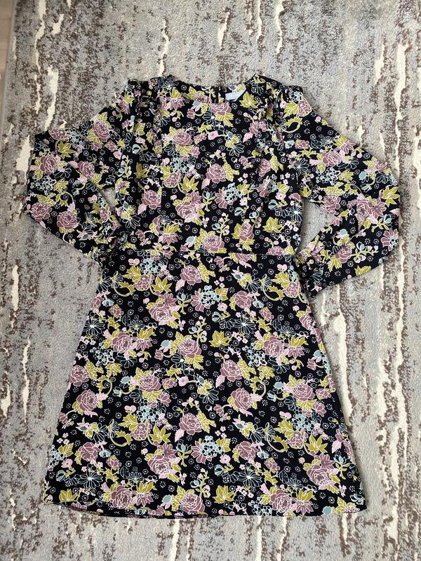 Гарна сукня. Розмір 12. Буде на м. Заміри - дов.90. Пояс-40. Низ вільний. Груди-46. Рукав-61. Тканина не просвічується. На спинці замочок. Не тягнеться.