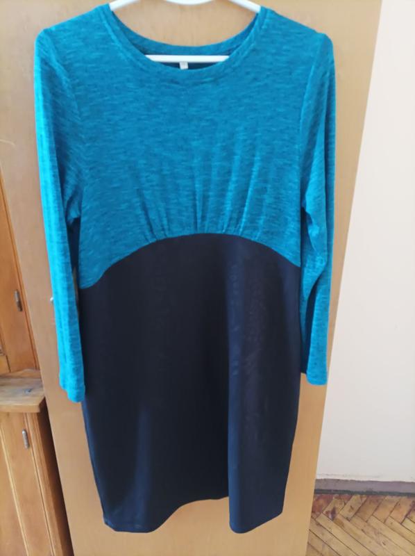 Красивое платье из двух видов ткани. Верх - тонкий трикотаж, низ - плотная ткань, немного с блеском, на свету просматривается рисунок. Тянется. Длина 100, плечи 42, рукав 60, ПОГ 47-55, ПОБ 56-59