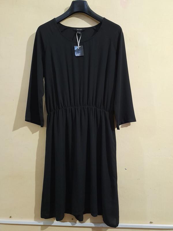 Новейшее шифоновое платье Esmara с подкладкой (не просвечивается), черного цвета. Рукав 3/4. Талия на резинке. Платье до колена. Размер: 42/14 наш 48-50 Замеры: Пог: 51 см. Талия: 34-46 Длина по спинке: 96 см. Длина от горла ло талии: 30 см. (спереди). Рукав реглан, длина от горловины: 54 см.