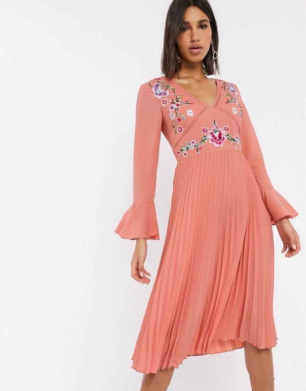 Розовое плиссированное платье миди с вышивкой и кружевными вставками ASOS DESIGN Uk 10 Пог 48 Пот 39 Длина 105