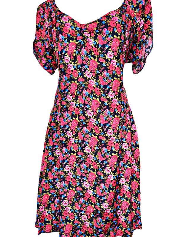 Мода на принты регулярно меняется, но мотивы цветов всегда поворачиваются. Это платье от Atmosphere (Primark) сделает твой силуэт идеальным, подарит легкость и комфорт твоей кожи. У модели короткие рукава, эплечики, горловина - фигурная, очень красивый вырез. Отрезная талия идет без резинки, а в длину груди расположен дополнительный шов, который собирает верх изделия мягкие складки. Низ изделия с прямыми краями, сзади немного длиннее, а в левом боковом шве расположена потайная молния. ПОГ: - 53 см., Довжина рукава : - 18 см., ПОТ: - 46 см., ПОБ: - 66 см., Довжина виробу: спереду - 92 см., сзаду - 96 см., плечі - 44 см.