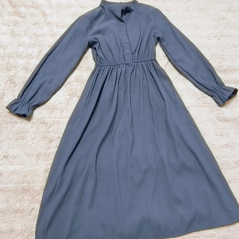 Плаття міді світло синього кольору об'єм в грудях 92 см об'єм в талії (резиночка) 54 см довжина 104 см довжина рукава 55 см