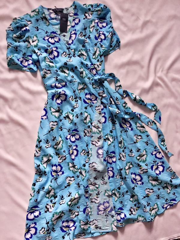 Сукня на запАх з тоненької , дуже приємної на дотик, невибагливої тканини ( поліестер, з еластаном ) в новому стані. Довжина 123 см, Довжина до талії 42 см, Ног. 52 см, Нос. 60 см, Талія регулюється.