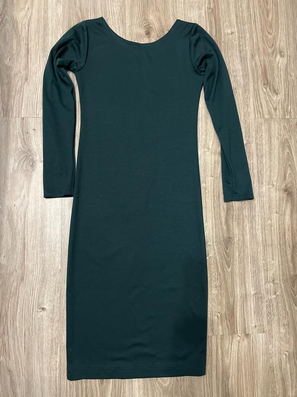 Платье длинное, зеленое бутилочного цвета, облегающее, длина платья 106 см, ширина по груди 37 см, длина рукава внутреннего шва 49 см.