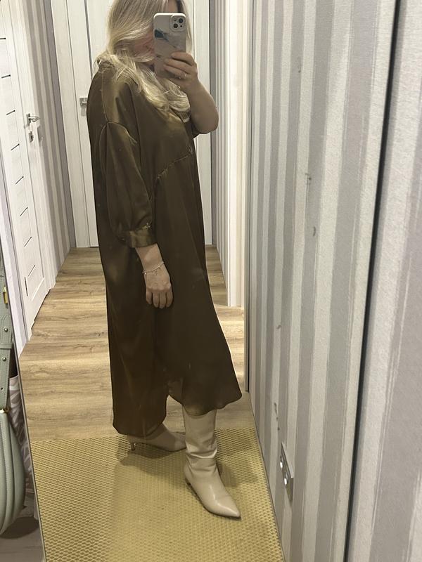 Невагома сукня-сорочка на ґудзиках вільного крою. На бірці вказано розмір S, але сміливо можна брати жінкам 50-го розміру та вона буде вільна. Тканина приємна на дотик, легка, має благородне переливання на сонці. Можна носити як сукню, так і накладати другим шаром.