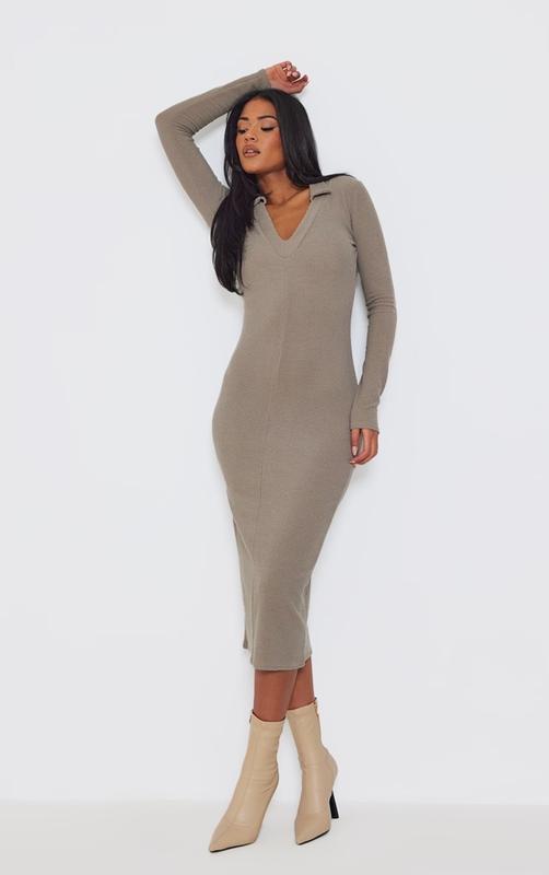 Платье поло по фигуре новое с биркой в рубчик длины миди бежевое коричневое