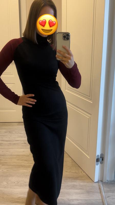 Плаття трикотажне. чорне, під горло, з бордовими рукавами. С/М Одягне на зріст 162 см. Воно по факту пряме, але виглядати може по різному, дивлячись, на які параметри буде одягнуто. Заміри самої сукні, напівобхват: ОГ - 41 ОТ - 39 ОБ - 43 Довжина плаття від плеча - 122 см Ширина плаття знизу - 96 см Є невеликий розріз з лівого боку. Тягнеться! Одягнене(!!) на такі параметри : ОГ - 86 ОТ - 72 ОБ - 92