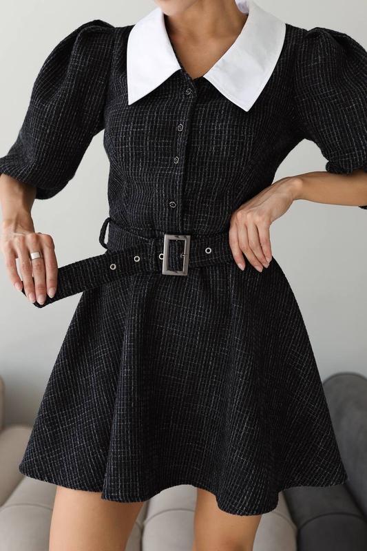 Твидовое платье чёрное короткое мини с твида с белым воротником с объемным рукавом с ремнё...