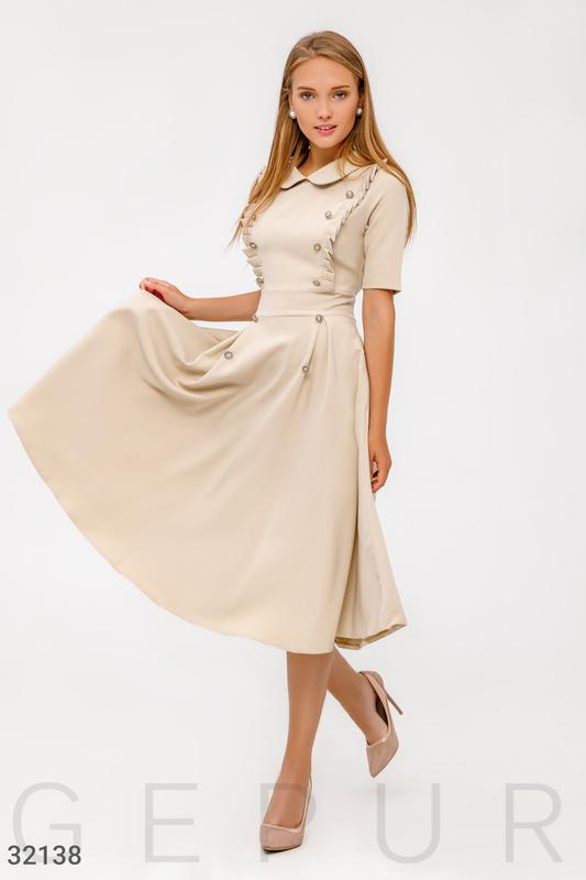 Сдержанное платье классического кроя с круглым вырезом, воротником, коротким рукавом, верх украшен рюшами и декоративными пуговицами, втачной пояс, юбка с карманами в швах. Размер S. Стан - идеальный. Одета один раз, на встречу студентов. Купила на сайте Gepur. Замеры дам по запросу.