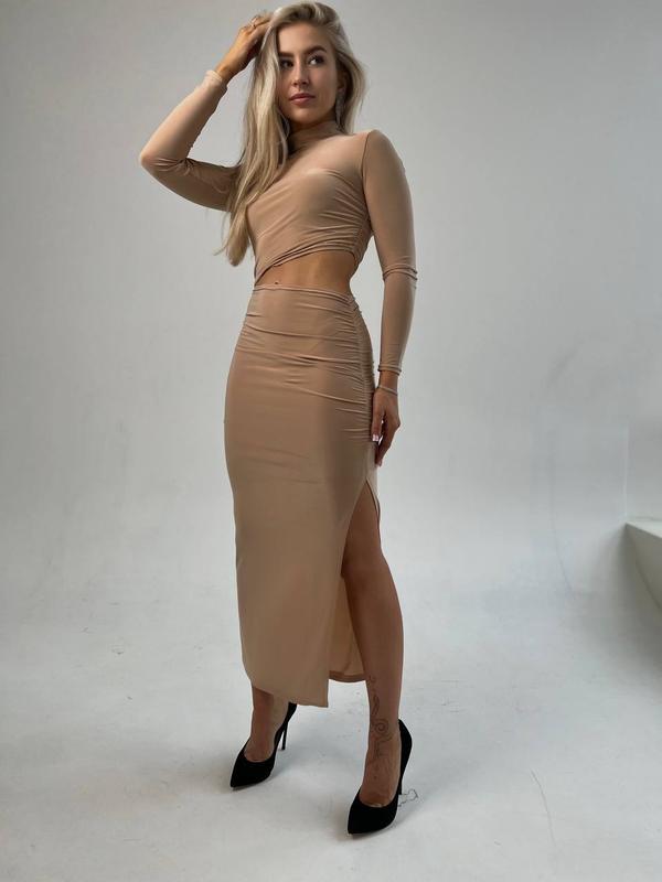 hb.072 Ткань: микромасло Размеры: 42-46 Цвет: черный, графит, бежевый Кокетное платье с акцентным вырезом на талии, на ноге разрез, драпировка по бокам очень выгодно подчеркнет вашу фигуру. Платье подойдет на любой случай жизни, для любого мероприятия и сезона 💃