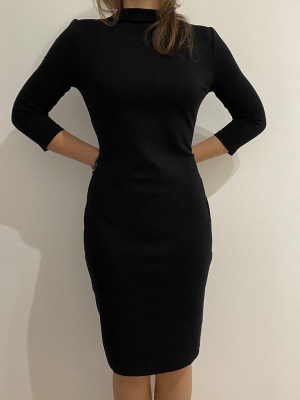 Привабливе гарне жіночне плаття чорного насиченого кольору з четвертним рукавом бренду Goldi, розмір S, і на М теж добре сяде. Ззаду на змійці. Тканина: 67% віскоза, 25% нейлон,5% спандекс, зовсім не виглядає поношеним, та повністю відповідає зробленим фото.Заміри: Довжина загальна 95см ПОГ 44 см ПОБ 47 см Півобхват знизу 40 Рукав четвертний тому рукав по верху 45 см Плечі 37 см Півобхват горловини 18 см Ззаду схований замочок від шиї до лопаток, + плаття має стрейч і гарно ТЯГНЕТЬСЯ