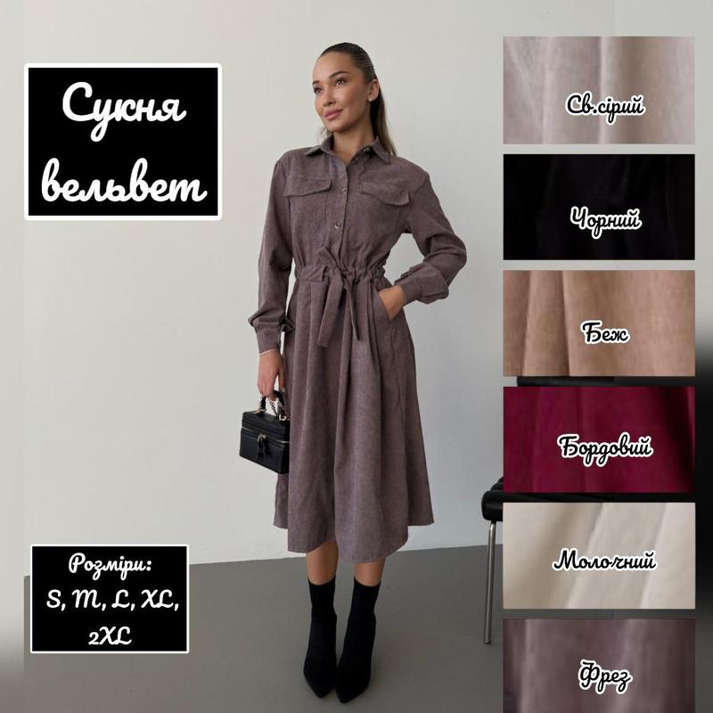 .💕⭐️💕 ПЛАТЬЕ 💕⭐️💕 Артикул SV 561 Ткань: микро-вельвет Цвет: бежевый, черный, бордовый, фрезовый, светло-серый, молочный Размеры: S, M, L, XL, 2XL Описание: Уютное платье-сорочка из микро-вельвета с нагрудными карманами в трендовых цветах. Модель средней длины, застегивается на пуговицы, талия без резинки, регулируется поясом, рукава на манжетах. (Размеры указаны на параметры) Есть видео обзор.