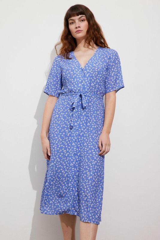 Размер:M Женственное платье в мелкий цветочный принт . Мягкая, драпирующаяся ткань. Застежка на пуговицы до самого конца спереди. Тканевый пояс на талии. Фигурные швы спереди и сзади. Узкий, слегка приталенный крой, который можно затянуть ремнем. Длина до середины икры.