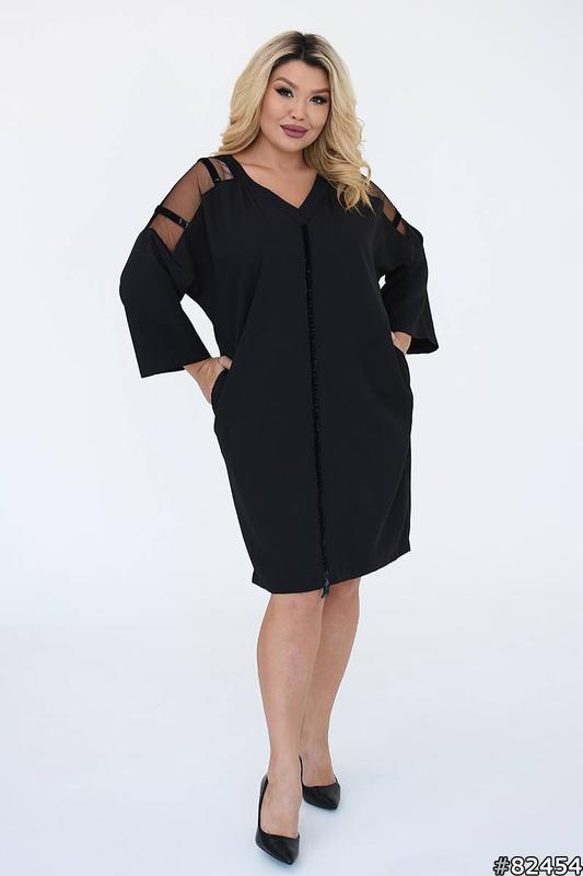 Розміри : 46-48,50-52,54-56,58-60,62-64 Колір : чорний Тканина : крепкостюмка , сітка Плаття вільного крою , рукав три четверті , з боків кишені , на плечах декоративна сітка , плаття прикрашене бархатною стрічкою на плечах та спереду. Заміри виробу : Розмір 46-48: Обʼєм грудей 120 Обʼєм талії 110 Обʼєм стегон 112 Довжина рукава від горловини 59 Довжина по спинці 98 Розмір 50-52: Обʼєм грудей 124 Обʼєм талії 118 Обʼєм стегон 120 Довжина рукава від горловини 60 Довжина по спинці 100 Розмір 54-56: Обʼєм грудей 132 Обʼєм талії 124 Обʼєм стегон 128 Довжина рукава від горловини 62 Довжина по спинці 101 Розмір 58-60: Обʼєм грудей 136 Обʼєм талії 132 Обʼєм стегон 136 Довжина рукава від горловини 62 Довжина по спинці 104 Розмір 62-64: Обʼєм грудей 144 Обʼєм талії 138 Обʼєм стегон 144 Довжина рукава від горловини 62 Довжина по спинці 104см вл