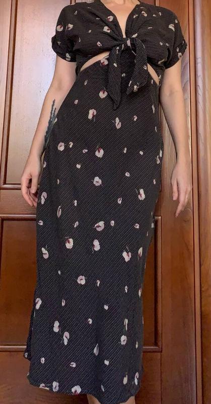 Сукня розмір S, український бренд Ksenija Andress. Тканина легка і дуже комфортна у спеку, тіло дихає. 100% італійська віскоза з моделюючими вирізами по лінії талії, аби її візуально зменшити. Акуратний ліф на вузлі, аби регулювати на грудях. Ціна на сайті -- 3390 грн.