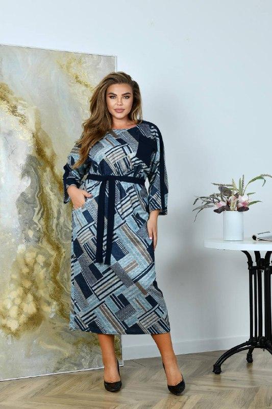 Платье Размеры 50/54, 56/60 Ткань трикотаж, ангора софт , хорошо тянется , мягкая, теплая. Цвет как на фото хаотичный рисунок в синем , коричневом и голубом цвете . Отделка синего цвета с накладным карманом и клапаном . Есть карманы , пояс входит в комплект . Сзади шлица . Замеры 50/54 ОГ-100-110, ОБ-110-120 ДР от центра спинки 66 ДИ -124 см 56/60 ОГ-112-122, ОБ-122-132 ДР от центра спинки 68 ДИ -125 см эл