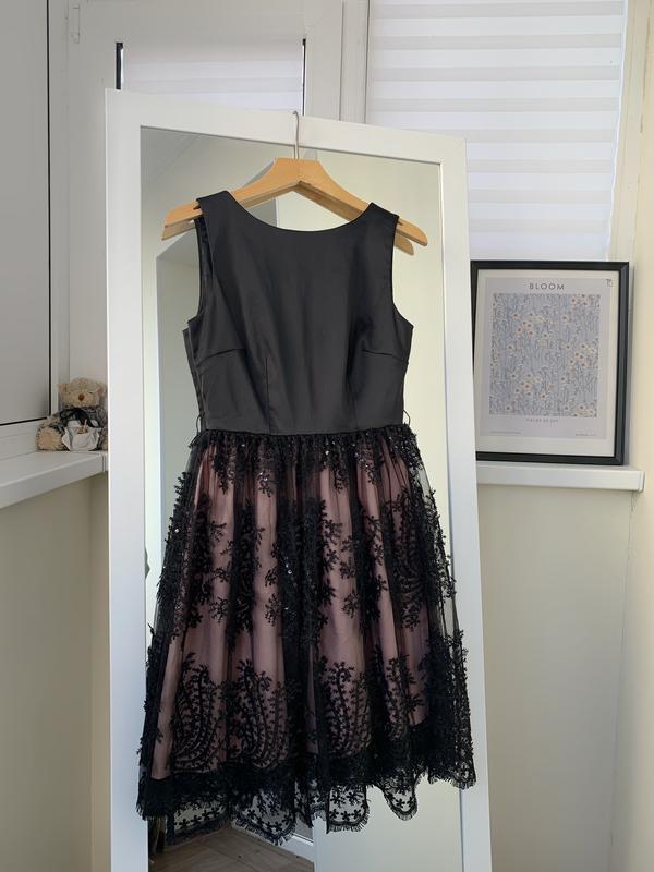 Красивое платье Размер XS Имеет красивое кружево и обшитое пайетками Полуобхват груди 40,5 см Полуобхват талии 33 см Есть лямки от пояса, пояса нет Длина 93 см Сзади на замочке Материал: 34% хлопок, 63% полиэстер и 2% спандекс Состояние: идеальный