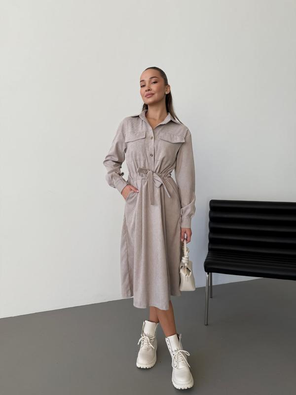 Арт. 25.11.во Ткань: микро-вельвет Цвет: бежевый, черный, бургунди, фрезовый, светло-серый, молочный Размеры: S, M, L, XL, 2XL Описание : Уютное платье-рубашка из микро-вельвета с нагрудными карманами в трендовых цветах. Модель миди длины, застегивается на пуговицы, талия без резинки, регулируется поясом, рукава на манжетах.