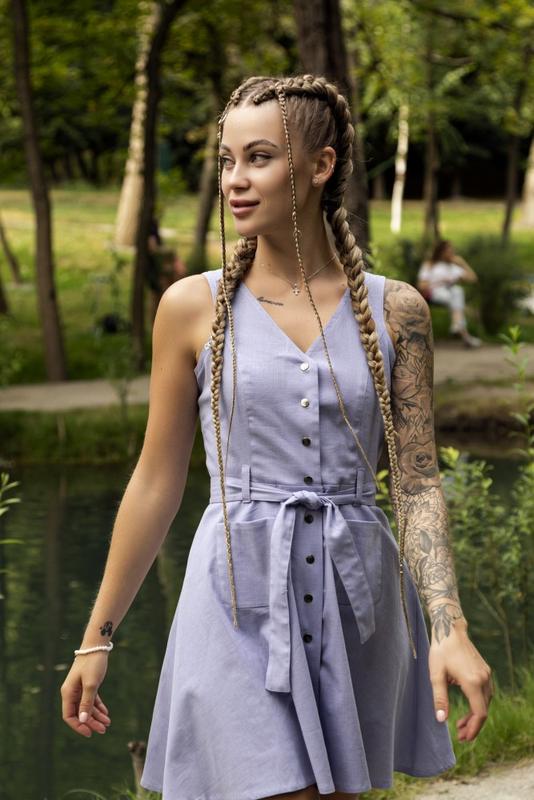 - Материал: лен; - Состав ткани: лен 80% + вискоза 20%; - Сарафан застегивается на кнопки, которые доходят до середины юбки; - Спереди V-образный вырез; - Два накладных кармана спереди; - В талии есть шлевки для пояса. Декоративный пояс в комплекте, в цвет сарафана. Юбка имеет свободный крой. ____________ Замеры : Размер S Общая длина : 88 см; Полуобхват талии : 35 см; Полуобхват груди : 42 см; Длина юбки : 46 см; Размер М Общая длина спереди : 91 см; Полуобхват талии : 37 см; Полуобхват груди : 44 см; Длина юбки : 48 см; Размер L Общая длина спереди : 93 см; Полуобхват талии : 39 см; Полуобхват груди : 46 см; Длина юбки : 49 см.