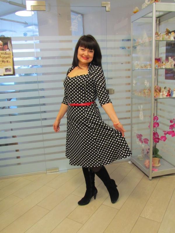 Сукня поза часом! Классика на годы! Всегда актуальная расцветка в горошек. Эта черно-белая гамма надевается практически всем. Платье очень выгодно подчеркивает декольте, талию и делает образ необычайно привлекательным. Платье на холодное время года, поскольку сшиты из шерстяного трикотажа. Ее можно украшать разными поясками, платками и текстильными цветами. Такой наряд будет уместным как на праздники так и в повседневной жизни. А главное, вы будете неповторимы, потому что это индивидуально пошитая вещь. И такой больше ни у кого не будет. Размер 46 (укр).