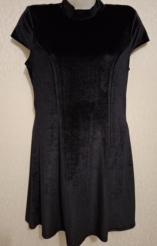 Платье женское,черная бархатная,с коротким,крылышком-рукав. сзади потайная молния, приталенное. Ворот-стойка Размер: S.см.замеры Плечи-38 Пог-44 Пот-40 Поб-53 Солнце-клеш Длина-87 100%полиэстер
