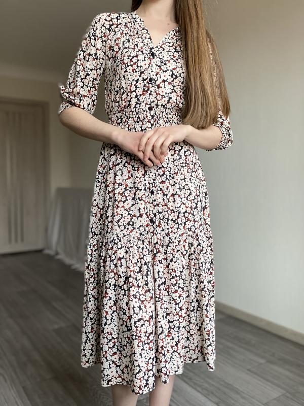 Невесомая и элегантная, отлично подчеркивает талию. 100% вискоза, по бирке xs, можно также на S Замеры: длина 120, полуобхват талии 28 (резинка тянется до 35 см), полуобхват груди 45 см, рукав 50 см Одетая на рост 175, бюст 84, талия 64, бедра 90. Стан идеален, есть маленькая зацепка у пояса на спинке, но в носке вообще не заметна благодаря принту. Пуговицы декоративные