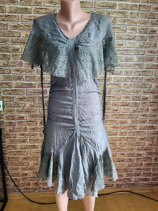 Это платье, изготовленное из легкого шелка без подкладки, создает воздушный эффект, имеет оригинальный асимметричный дизайн, который добавляет нотку неповторимого шарма. Почти невесомая. Цвет напоминает приглушенную морскую волну. Размеры: обхват груди: 80-82 см, обхват талии: 70 см, длина: прибл. 100 см (через ассиметричный крой мерки могут несколько отличаться). Платье слегка тянется для комфортной посадки и застегивается на боковые пуговицы. Пожалуйста, обратите внимание: возле верхней кнопки с внутренней стороны есть небольшой разрыв, и вторую кнопку сверху нужно заменить.
