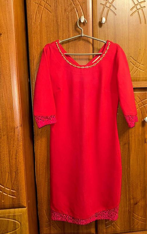 Платье красного цвета. Производитель Турция. Трикотаж, состав: 85% коттон, 10% вискоза, 5% эластан. Замеры: ПОГ 48 см, ПОТ 41, ПОБ 47, длина платья 99, длина рукава 41, глубина декольте 13-14. Есть следы шариковой ручки в двух местах. Состояние очень хорошее, почти идеальное, если бы не следы от ручки, катышек не имеет. Вещь одевалась несколько раз. Модели на фото платье замалё. Параметры модели (для ориентирования) грудь/талия/бедра - 98/80/111.
